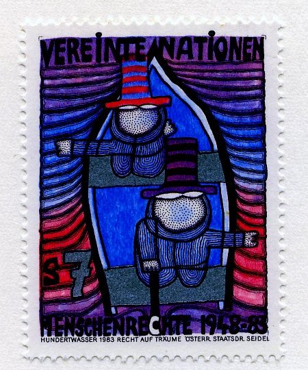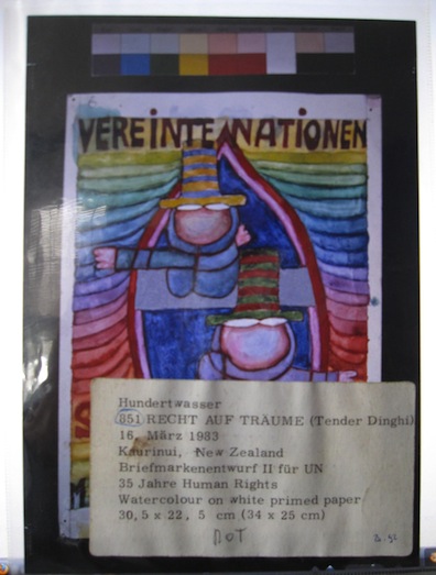 This, I’ll confess, is my favorite stamp, which is why I spent some time hunting down Hundertwasser’s original submission transparency, which captures all the detail in the stamp on a larger, more vibrant scale than the finished product.