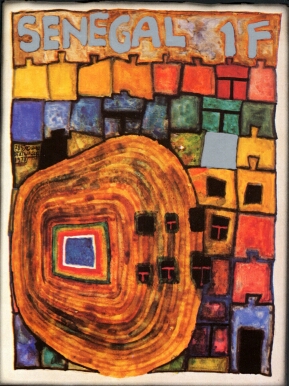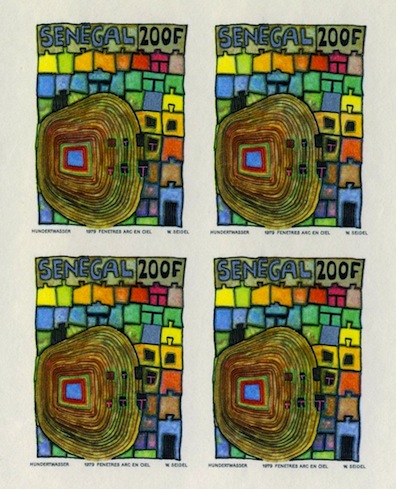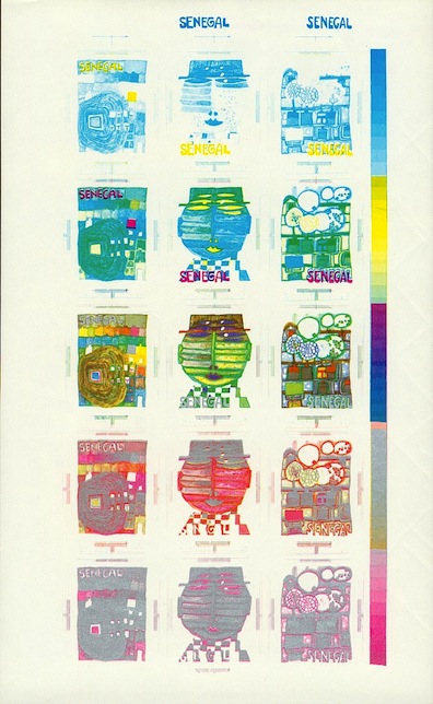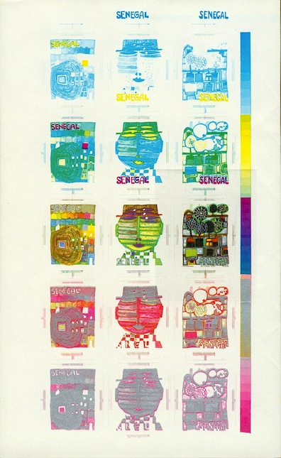 The Senegal stamps are as well documented as Austria’s Spiral Tree, with the added bonus of the printing process being captured in printer’s proofs in collectors hands. There are 5 different ones that I know of (although I only own the 4 shown here). It’s very interesting to see how each color field comes together for the final version.