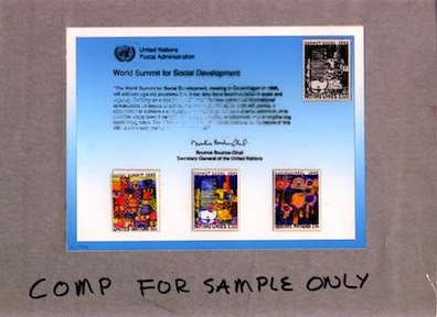 These stamps are sent as samples to reviewers, postal authorities and sometimes used to design collateral around a stamp (such as in the artwork below from the UN in 1995).
