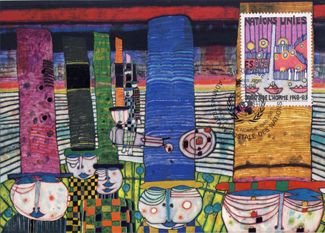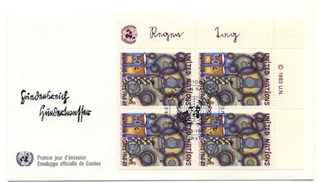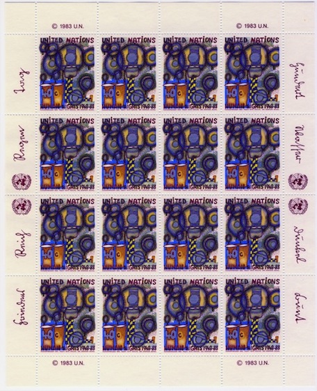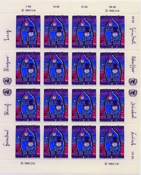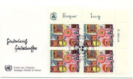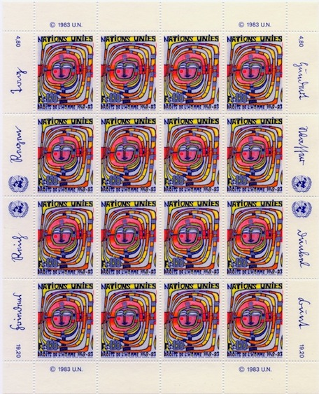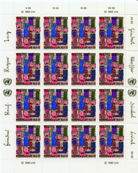 All original designs to commemorate the 35th anniversary of the Universal Declaration of Human Rights. This was the first time the Secretary General of the United Nations commissioned an artist to create a set of stamps.