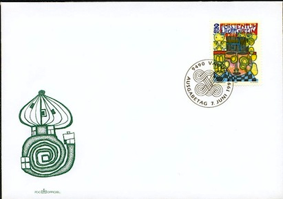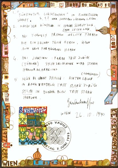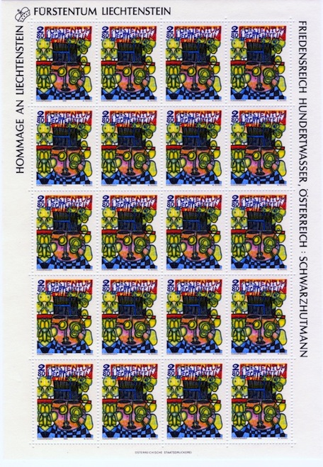 An original stamp design (I believe his last) and the first in the series Hommage a Liechtenstein, which was coordinated by Hundertwasser.