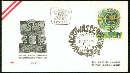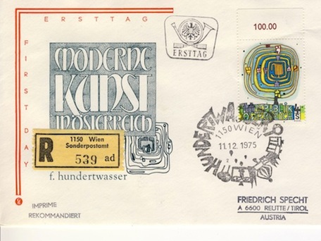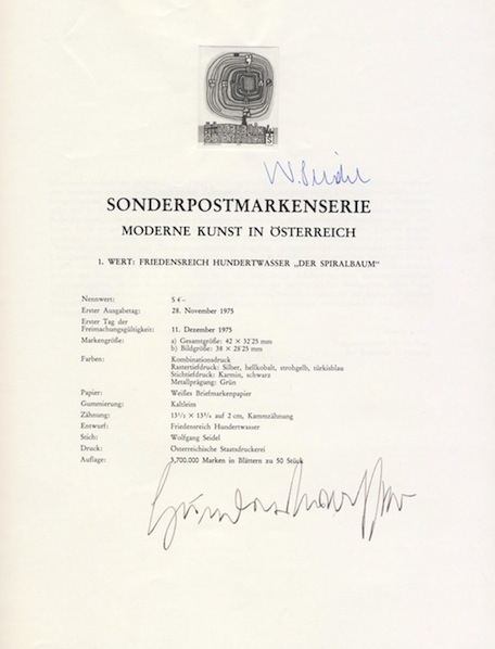 The first stamp issued that was actually designed by Hundertwasser to be a stamp. It was the first stamp in the series of Austrian stamps entitled “Modern Art in Austria”. It was also the beginning of the collaboration between the engraver Wolfgang Seidel and Hundertwasser - a partnership that makes these stamps so desirable decades later.